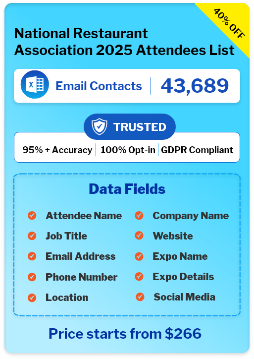 The NRA show 2025 Attendees Email List is a highly targeted and verified database containing the professional contact details of attendees from the National Restaurant Association Show 2025. It allows businesses to directly connect with decision-makers, streamline B2B communication, and promote products and services to an audience that is actively engaged in the foodservice sector.ย